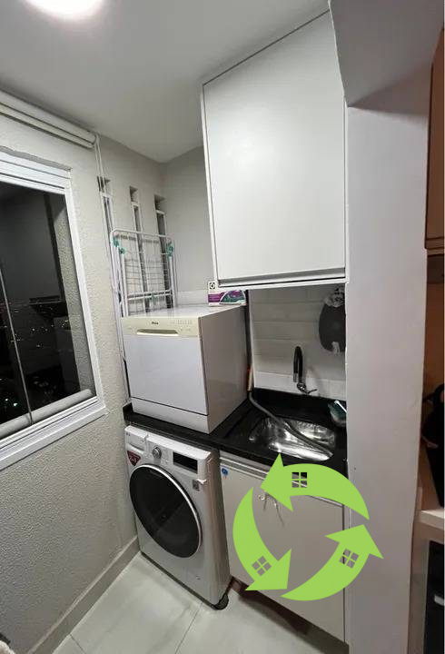 Sacada com envidraçamento, armários de lavanderia e pedra em mármore São Gabriel. Prateleira móvel de separação de roupas.