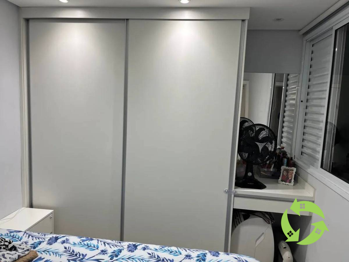 Quarto casal com porta de correr, ( o que faz caber uma cama queen), guarda-roupa de 1.80 metros até o teto com 4 gavetas grandes, cabideiro. Penteadeira com iluminação específica, gaveta, tomada na mesma e com adaptação para ar condicionado portátil.