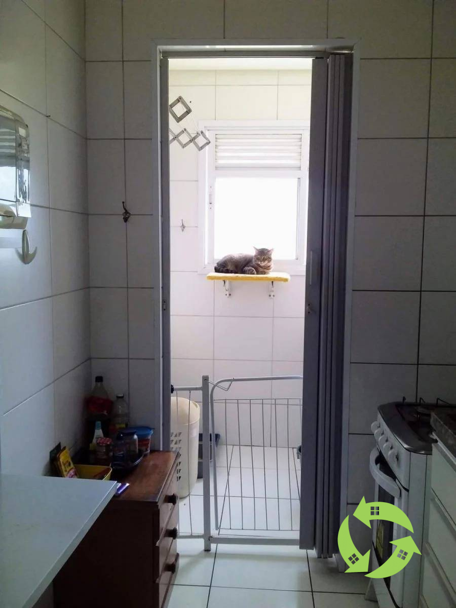 O apartamento tem piso vitrificado e armários na cozinha, wc e lavanderia