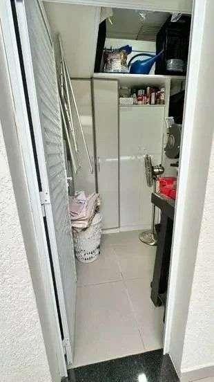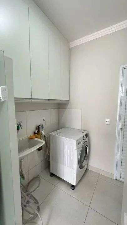Lavanderia toda mobiliada, o que traz muito espaço para guardar os itens.